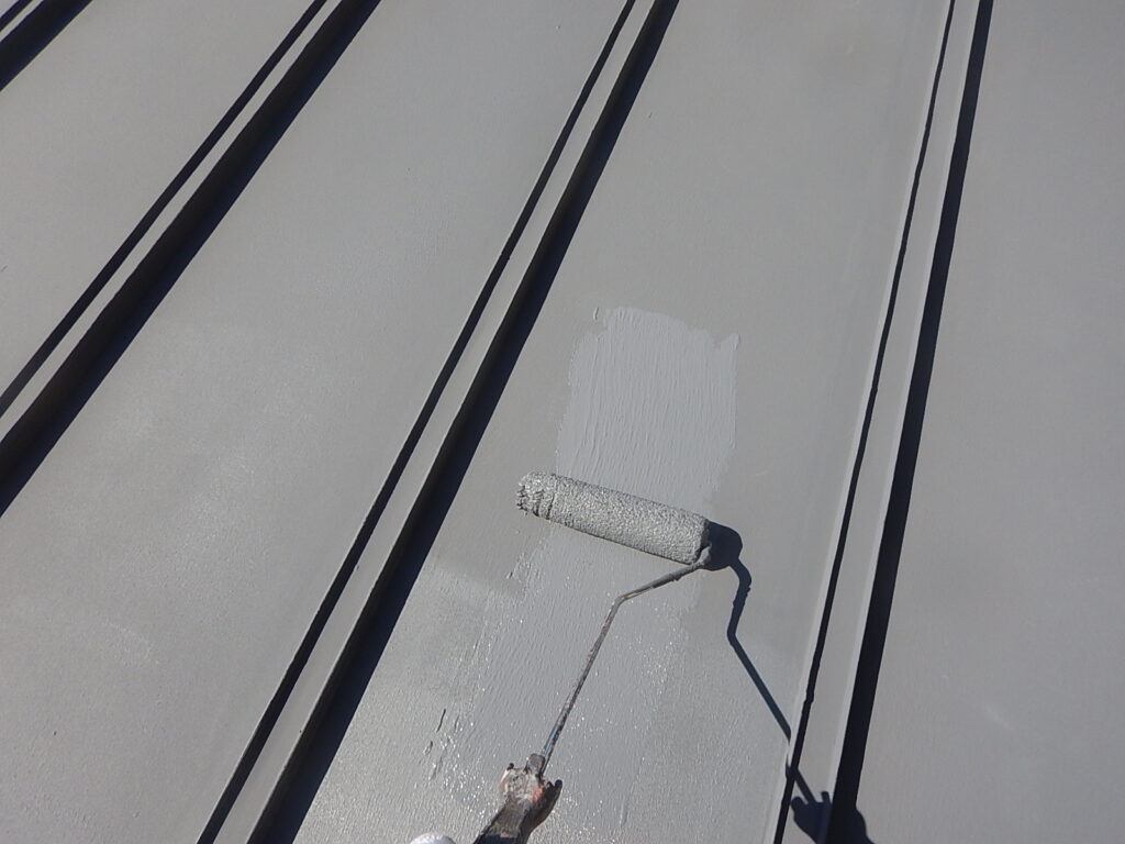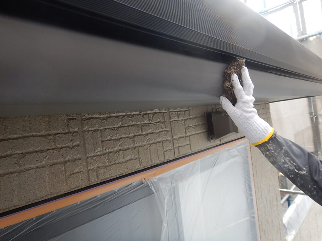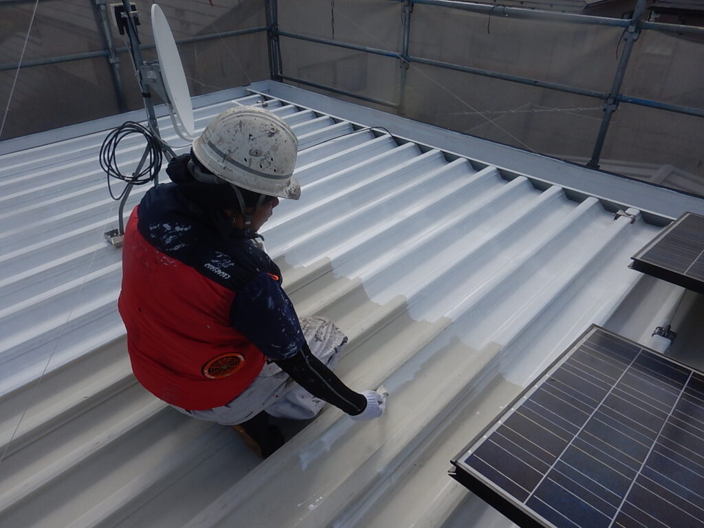 総2階建て48坪の建物の外壁はサイディングですが、板目地は塩ビ製のガスケット仕様でサッシ廻りにもシールは打たれていません。但し、増築棟の板目地はシールが打たれており、サッシ廻りシールと共に変性シリコン打替えとさせて頂きました。 サイディングの褪色や色ムラなどもなく、弱溶剤系フッ素クリアー塗料を選択して頂き、屋根は母屋・増築棟共に断熱塗料のガイナをお勧めしました。 母屋の折半屋根は一部に落下物によると見られる塗膜剥がれが有りましたが、チョーキングが若干見られる程度で比較的良好な状態でした。